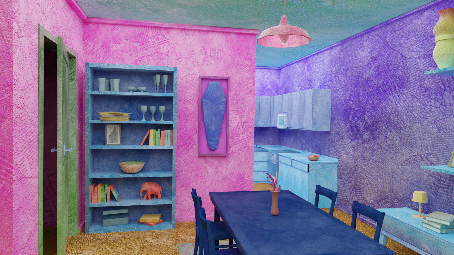 The environments start out in black and white, and slowly regain their colors the more the main character Anouschka advances throughout her storyline. A paper texture is added to the environments, to create a stop-motion feeling. These renders are of the finished colored environments that I worked on.